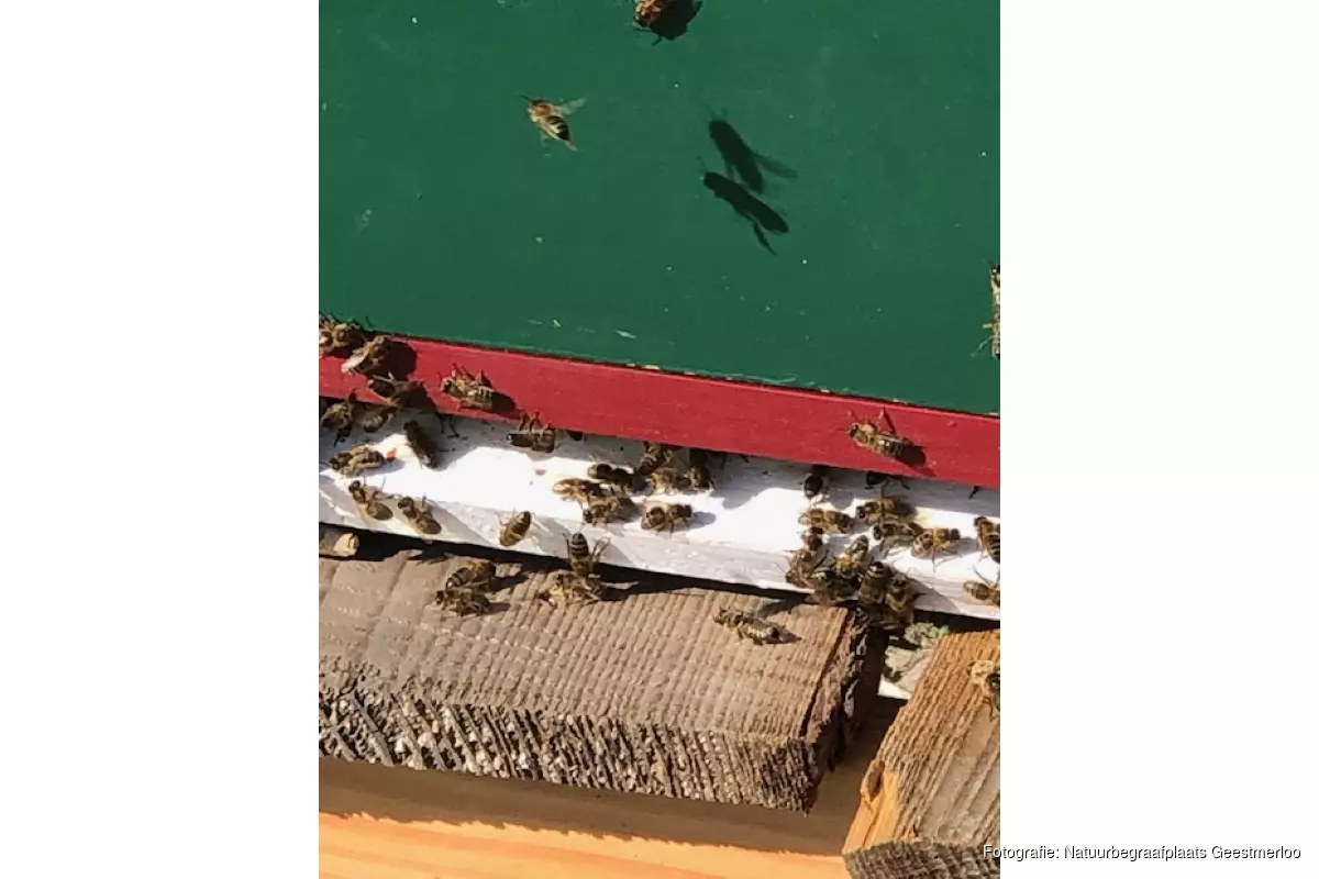De imker uit Alkmaar heeft twee van zijn bijenvolken overgebracht naar Geestmerloo. Daar hebben zij in de nieuwe bijenkasten elk een broedkamer voor de koningin en haar larven. Pasgeboren bijtjes blijven eerst nog in de kast; daar doen zij allerlei huishoudelijke taken. Zodra de bijen groot genoeg zijn, na ongeveer drie weken, vliegen ze uit. Een interessant proces, vertelt Wout: “Zij vliegen uit, scannen de omgeving en keren terug. Telkens een stukje verder, tot ze de omgeving prima kennen en weten waar ze nectar en stuifmeel kunnen vinden. Ze gaan wel drie kilometer ver, maar keren altijd terug voordat het donker wordt.”
